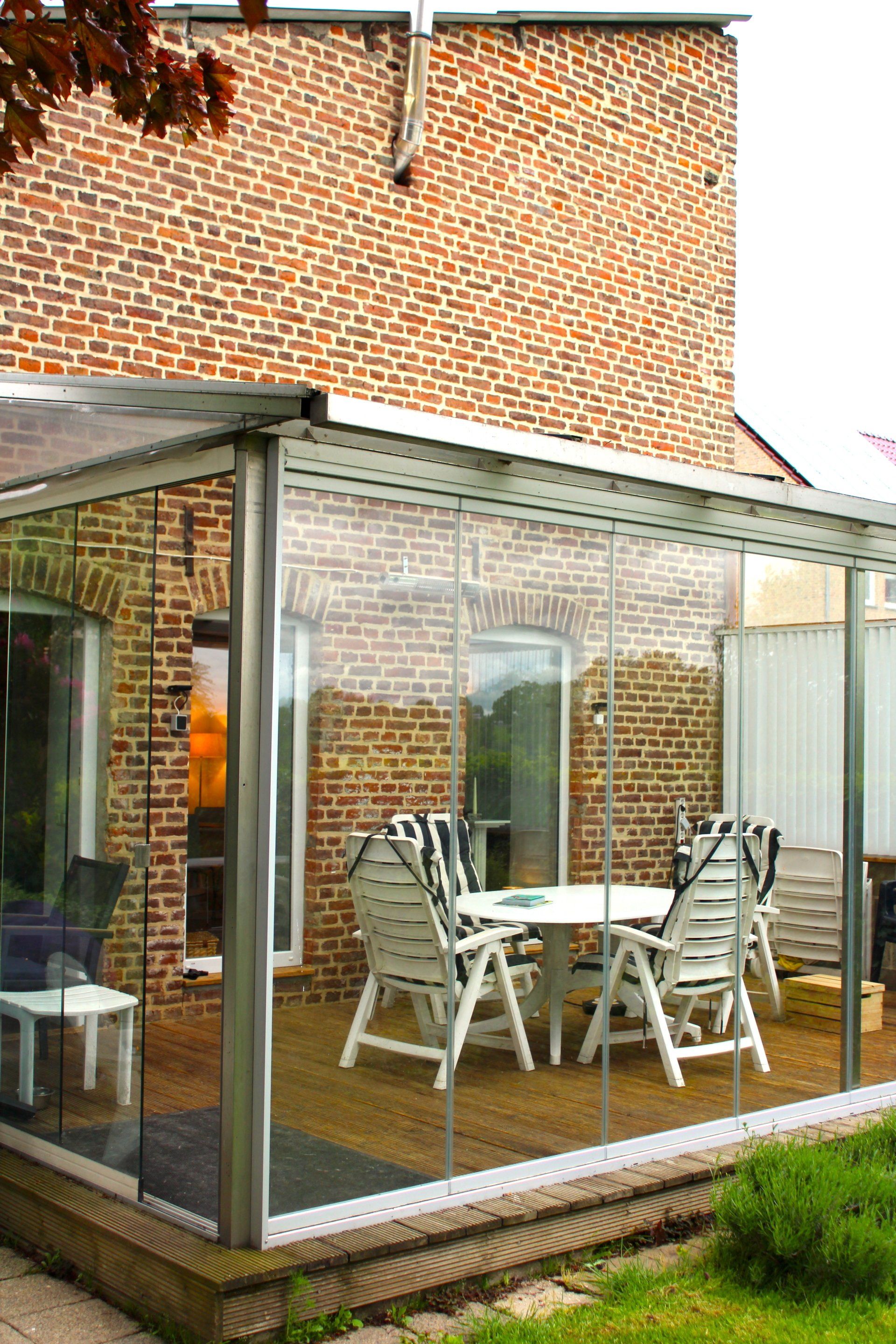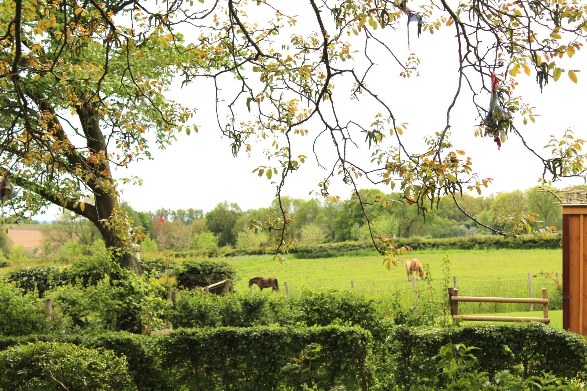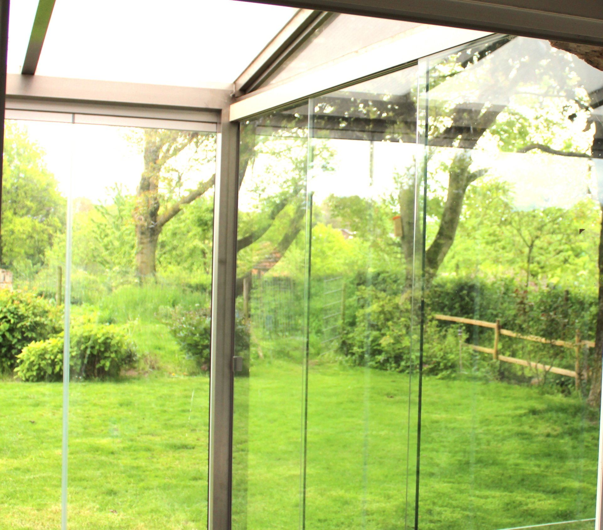 Vanuit de serre is er mooi uitzicht over de achterliggende gezamenlijke tuin en weilanden.