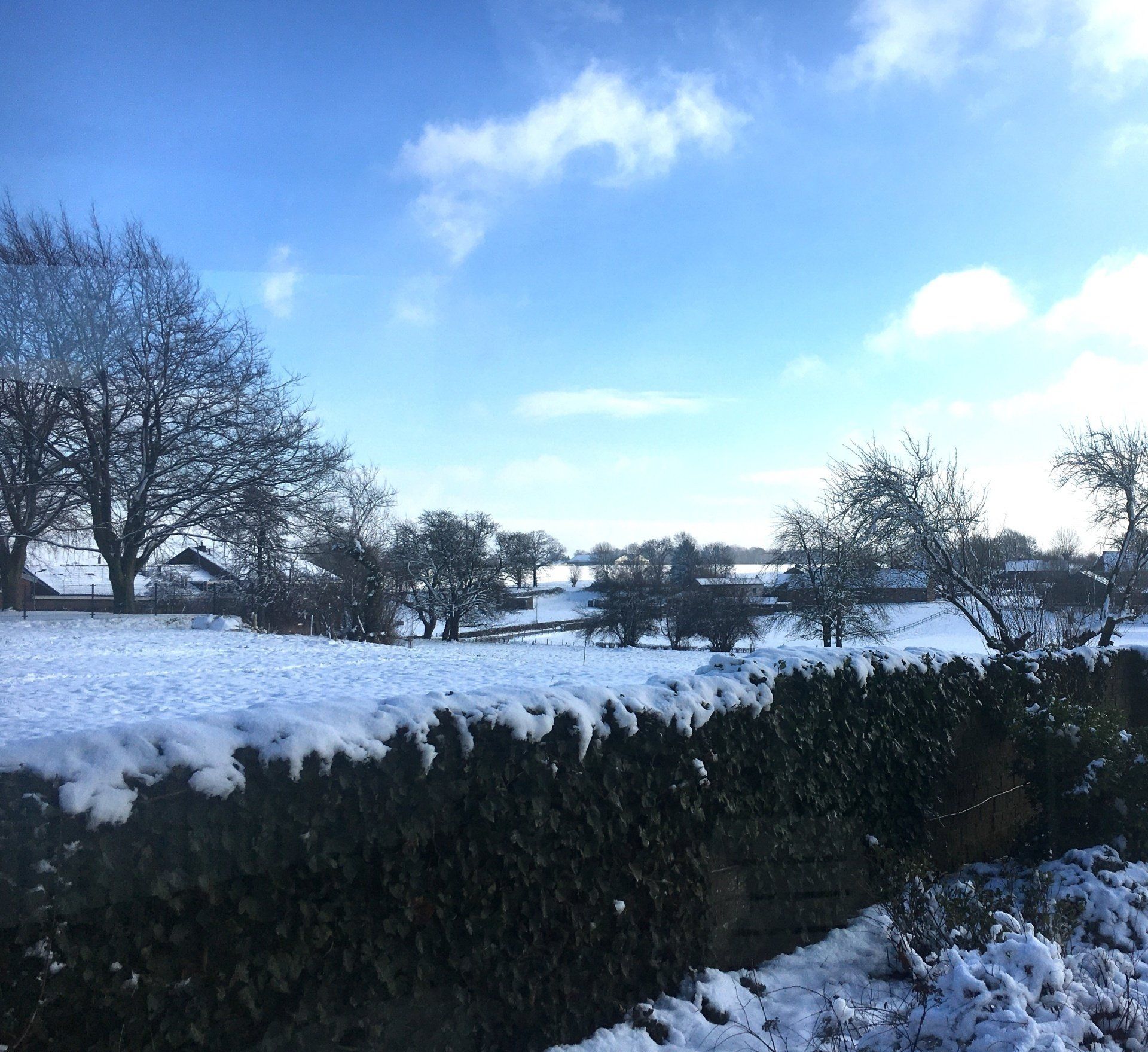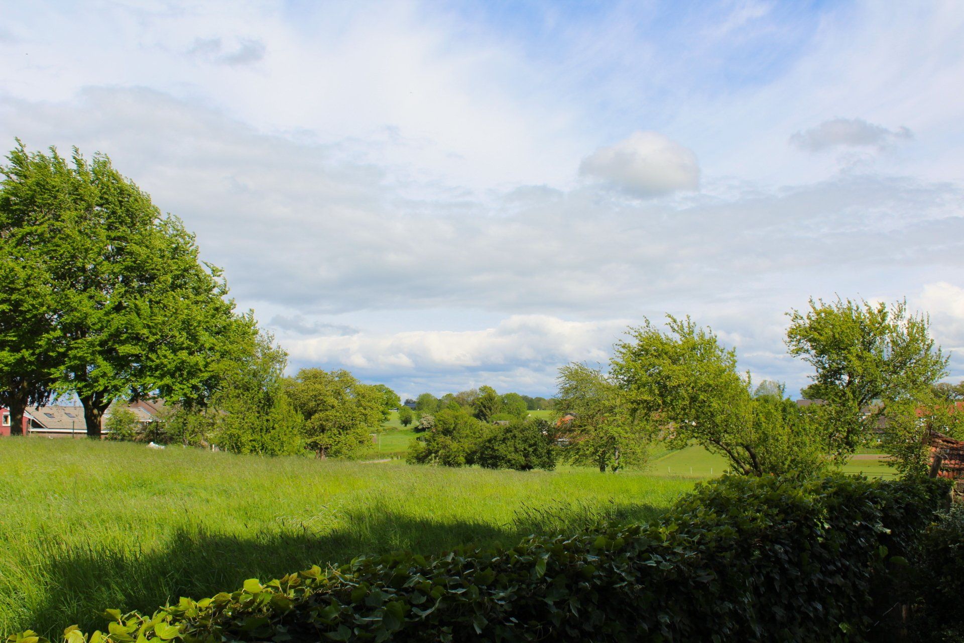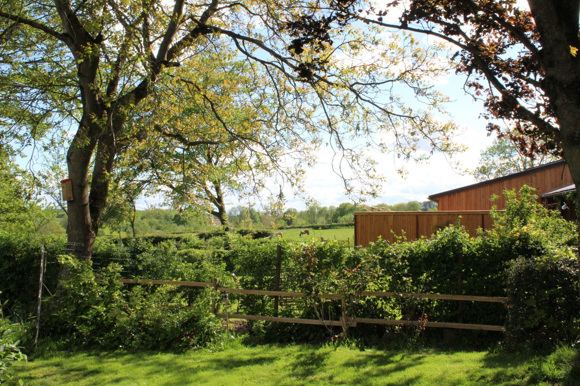 Vanuit de serre is er mooi uitzicht over de achterliggende gezamenlijke tuin en weilanden.